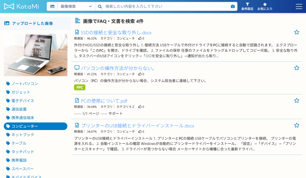 AIが画像を分析し、キーワードや画像から関連するFAQ・文書・画像を検索できます。